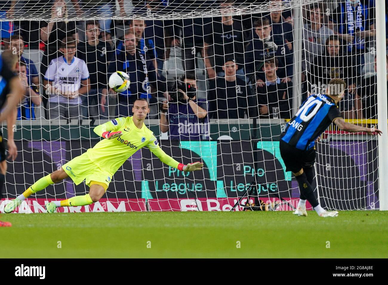 Brugge Belgium July 17 Penalty By Noa Lang Of Club Brugge Maarten Vandevoordt Of Krc Genk During The Pro League Supercup Match Between Club Brugge And Krc Genk At Jan Breydelstadion On July 17 2021 In Brugge Belgium Photo By